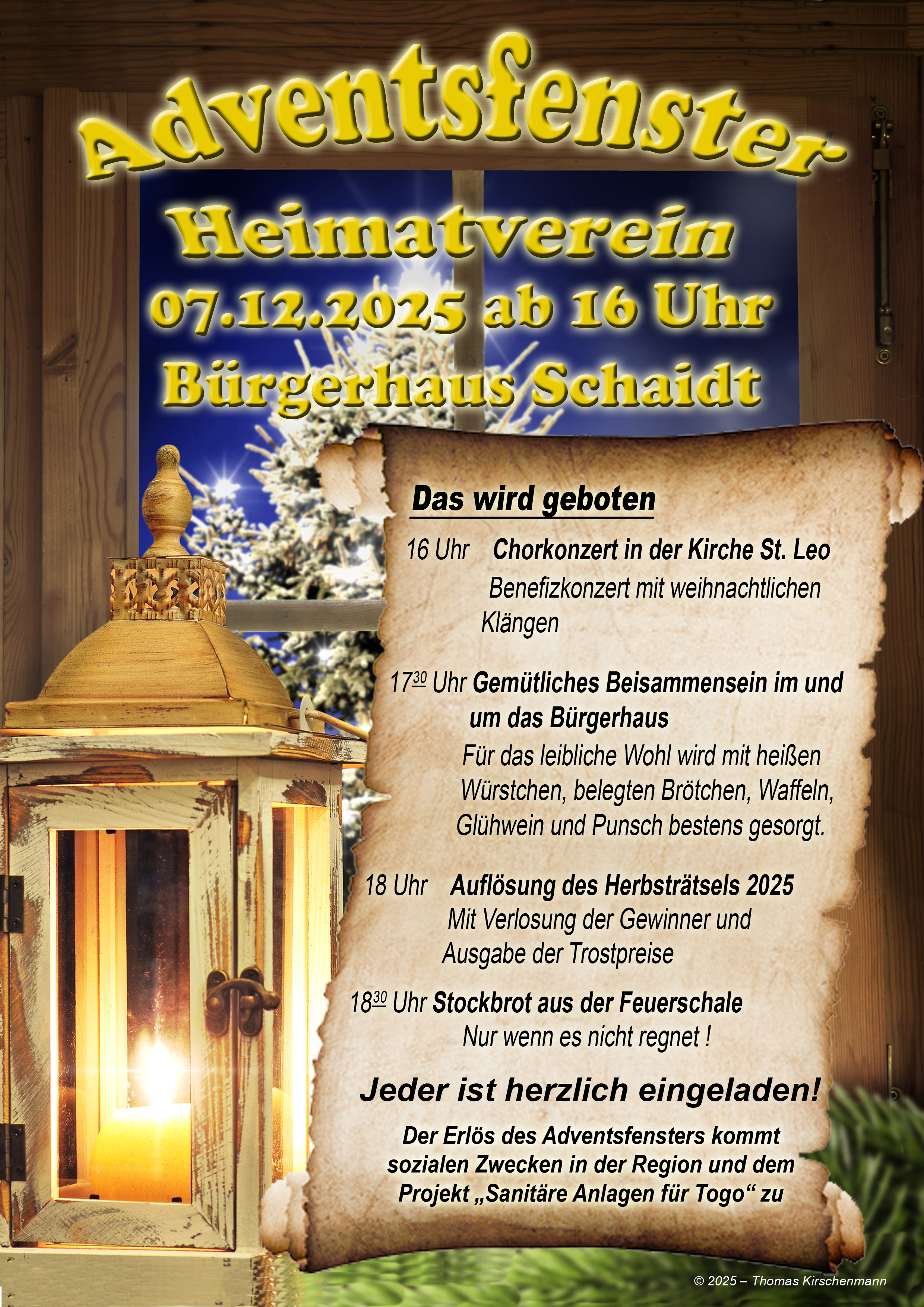 Am 2. Advent, 07.12.2025, lädt der Heimatverein Schaidt wieder alle Bürgerinnen und Bürger zu seinem Adventsfenster ins Bürgerhaus von Schaidt ein.